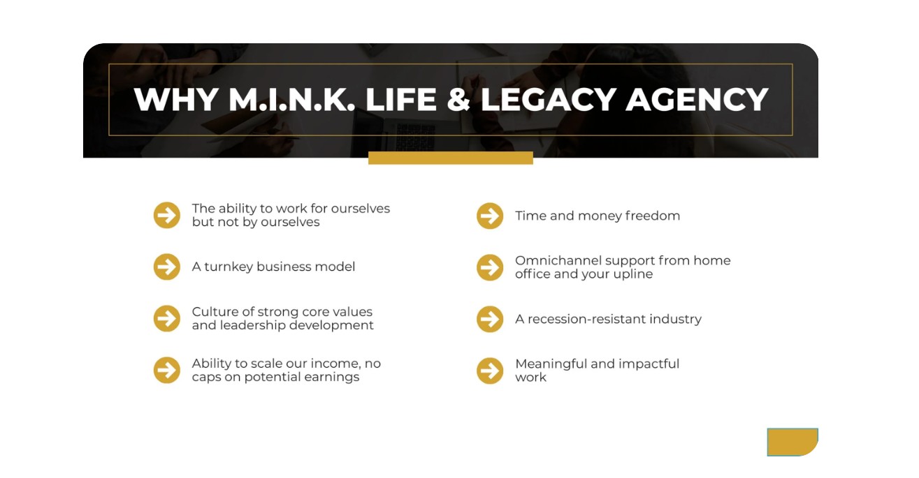 Mink Life & Legacy is built for individuals who want ownership, not oversight. Most of our top producers started with zero experience in life insurance, no polished résumés and no sales backgrounds. What they brought instead was work ethic, coachability, and a genuine desire to grow. We provide the proven systems, weekly live mentorship, technology, and ongoing support needed to help you succeed, along with a clear path to leadership for those who want to advance. You don’t need everything figured out to thrive here . You need consistency, commitment, and the right environment. That’s exactly what we provide.